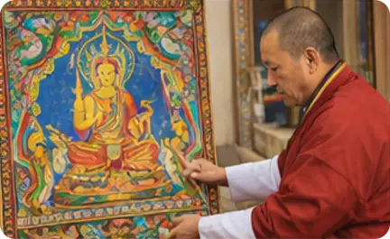 These paintings depict deities, legends, and protective symbols, preserving religious teachings through vibrant colors and refined detail.